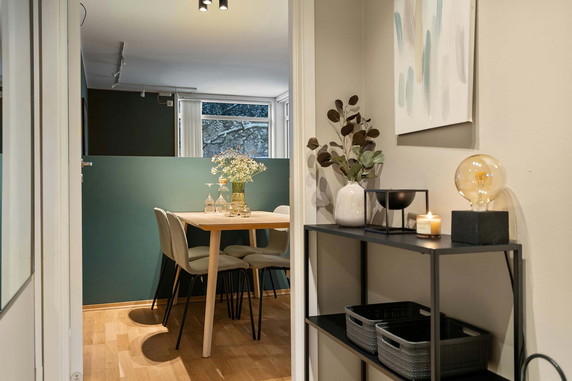 - Ein abgesetzter Wandabschnitt schafft visuell einen Essbereich.