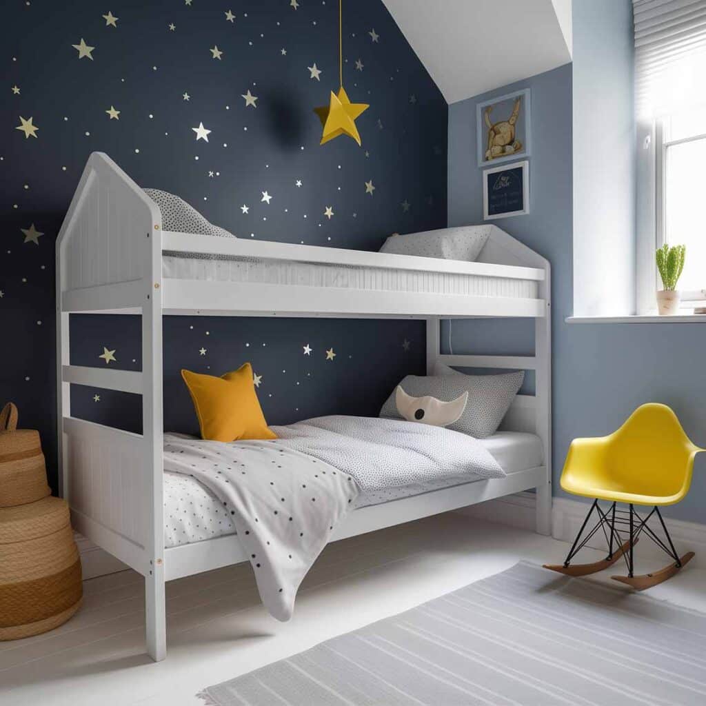 Auch im kleinen geteilten Kinderzimmer können dunkle Wandfarben Atmosphäre schaffen. Hier ein Zimmer für kleine Sternenwanderer. So träumt es sich gleich viel besser.