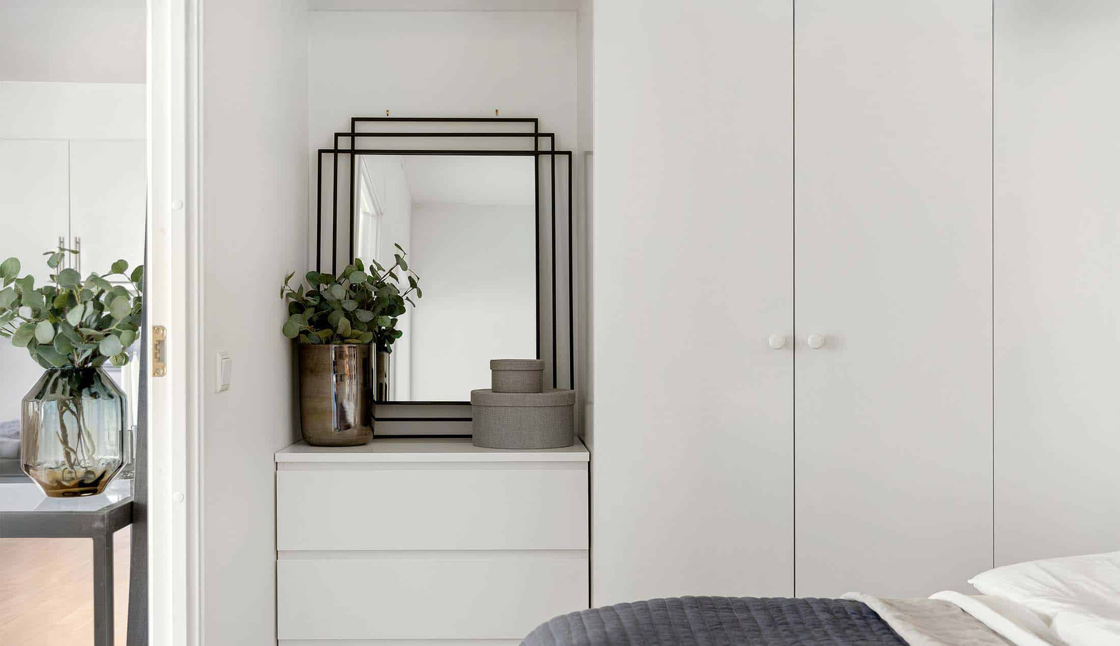 - Im Schlafzimmer: Ein hoher Spiegel neben dem Bett verlängert den Raum und markiert gleichzeitig einen Bereich für Anziehen und Styling.
